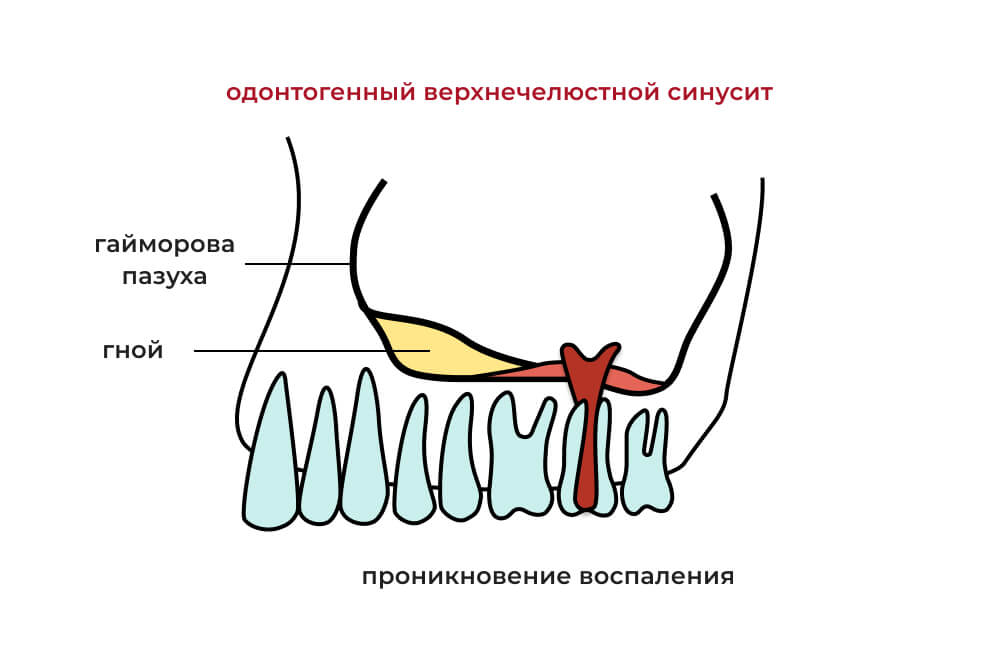 Вследствие расположения верхнего зубного ряда в верхнечелюстной кости, при воспалении в области корней клыков, премоляров и моляров, патологический процесс может перейти в верхнечелюстную пазуху. В ряде случаев корень зуба может выступать в пазуху.